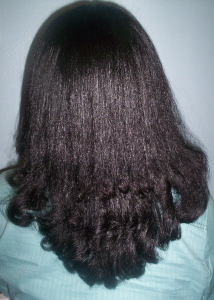 Every 6 months, I go to my beautician. She flat irons, then presses, trims and curls my hair. That is the only time I trim my hair and I usually lose about 1/2 to 1 full inch each time. I wear my hair straight for a week or so just for dh and then the first wash after, I do a deep condition with protein and moisture.